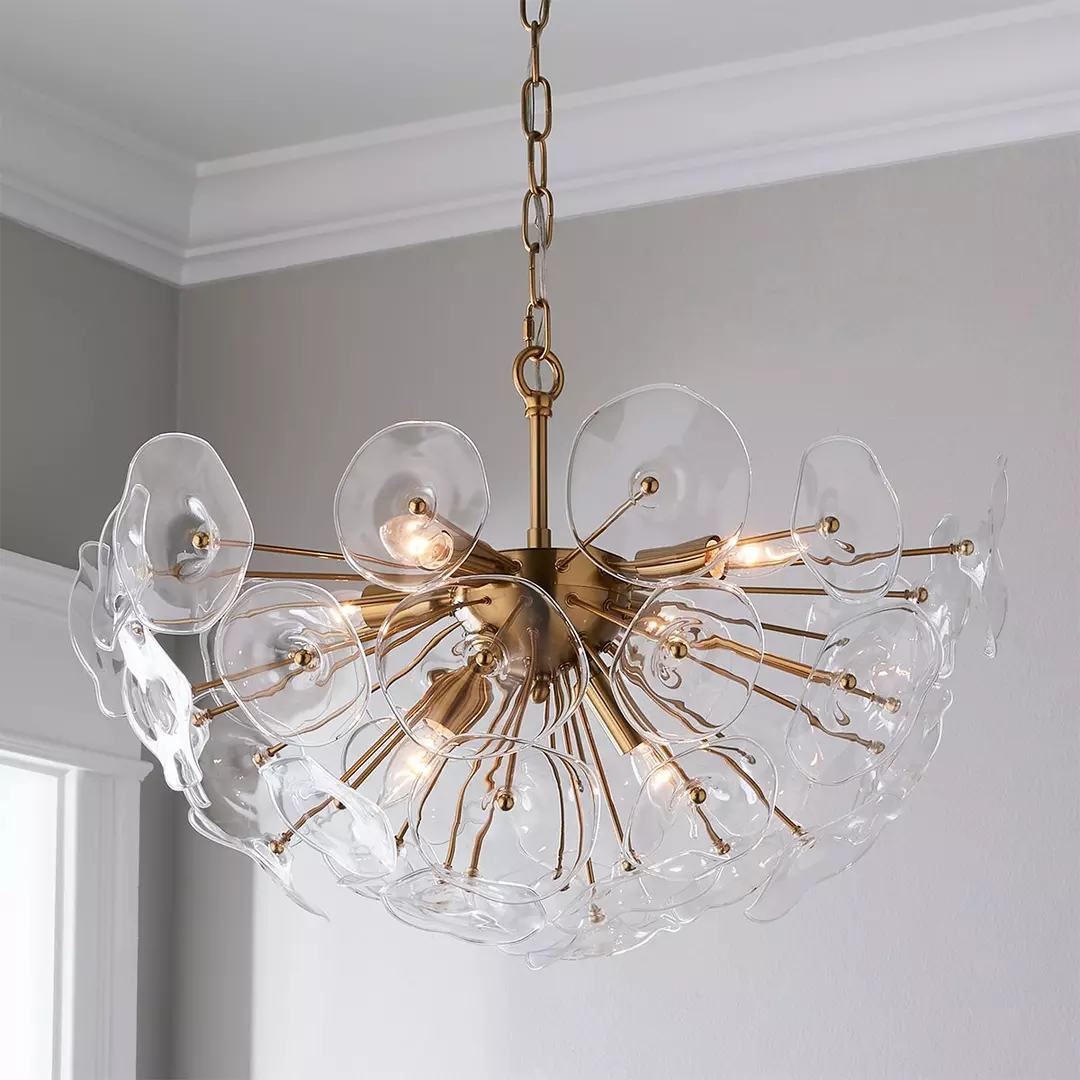 A unique take on modern design in a favored bowl silhouette, our Kendari Chandelier will be the wow factor your dining room is looking for. The wavering glass elements are matched with plated brass for warm light and flair of sophistication.